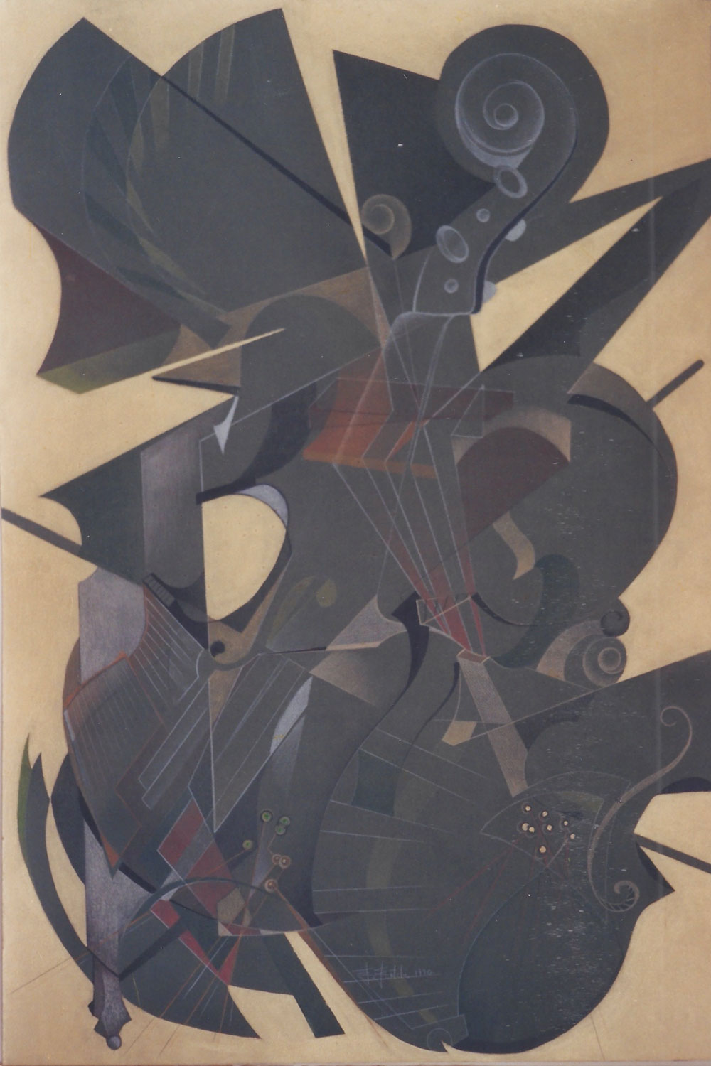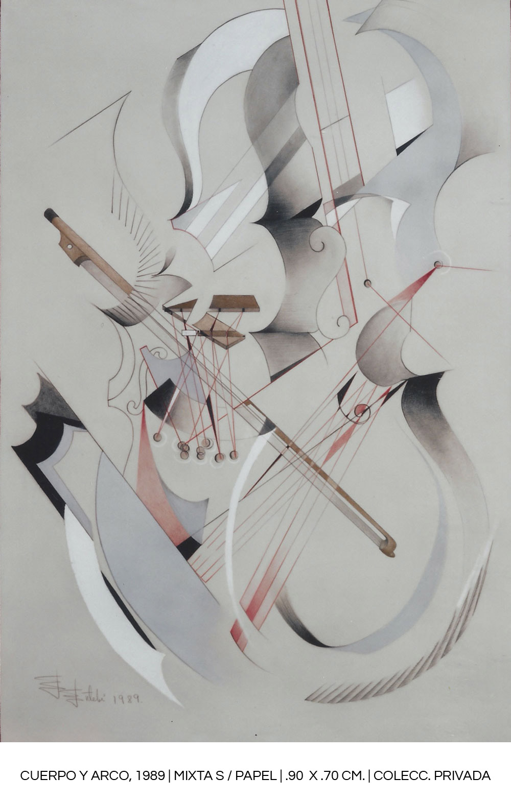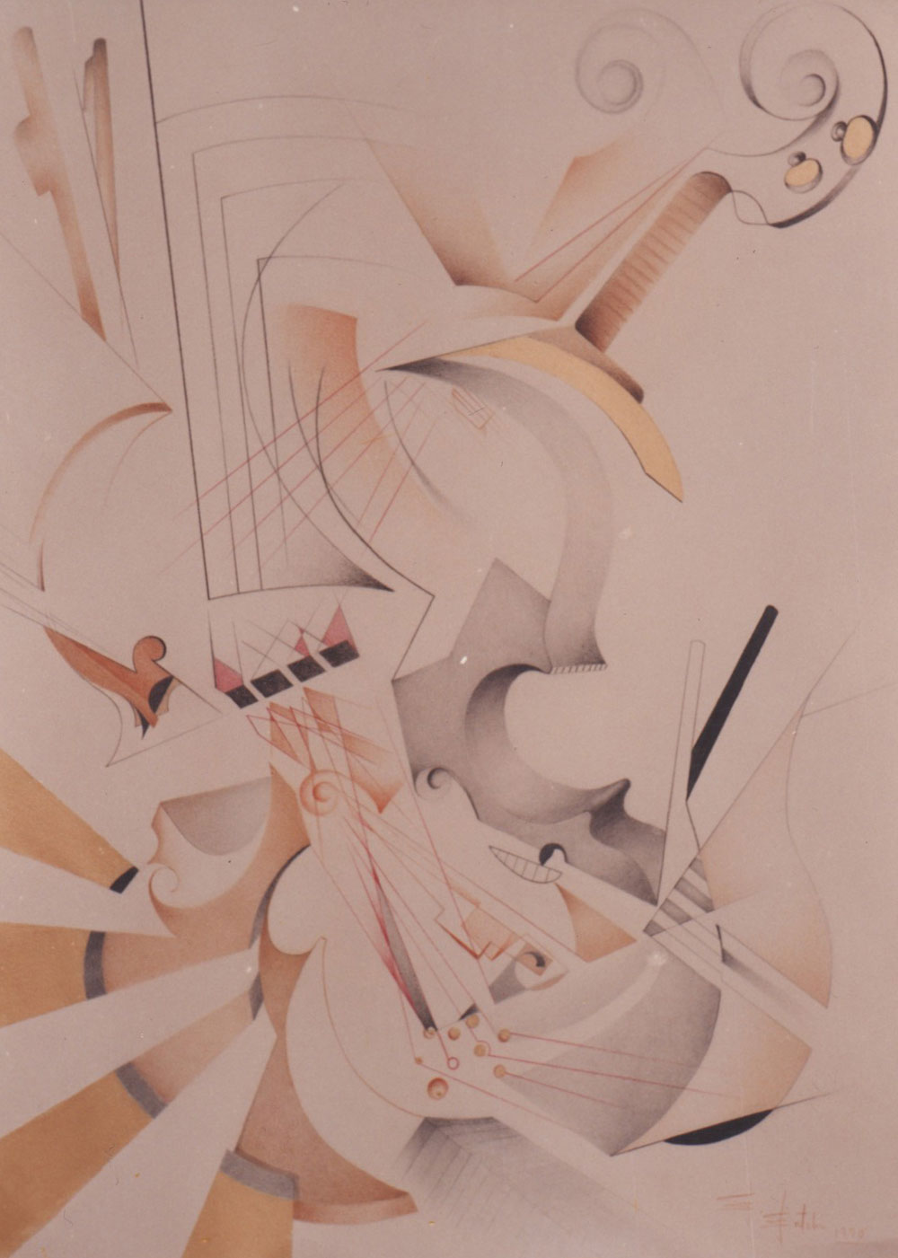 “La estructura rígida del cuadro es rota así por la vibración de líneas, tonos, toques de color y curvas que a veces figuran parte clave del violín.”