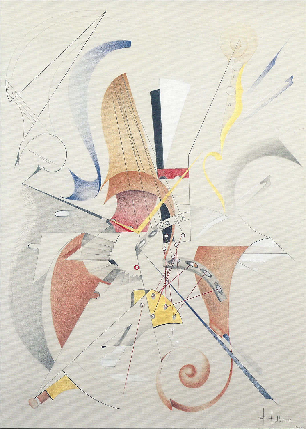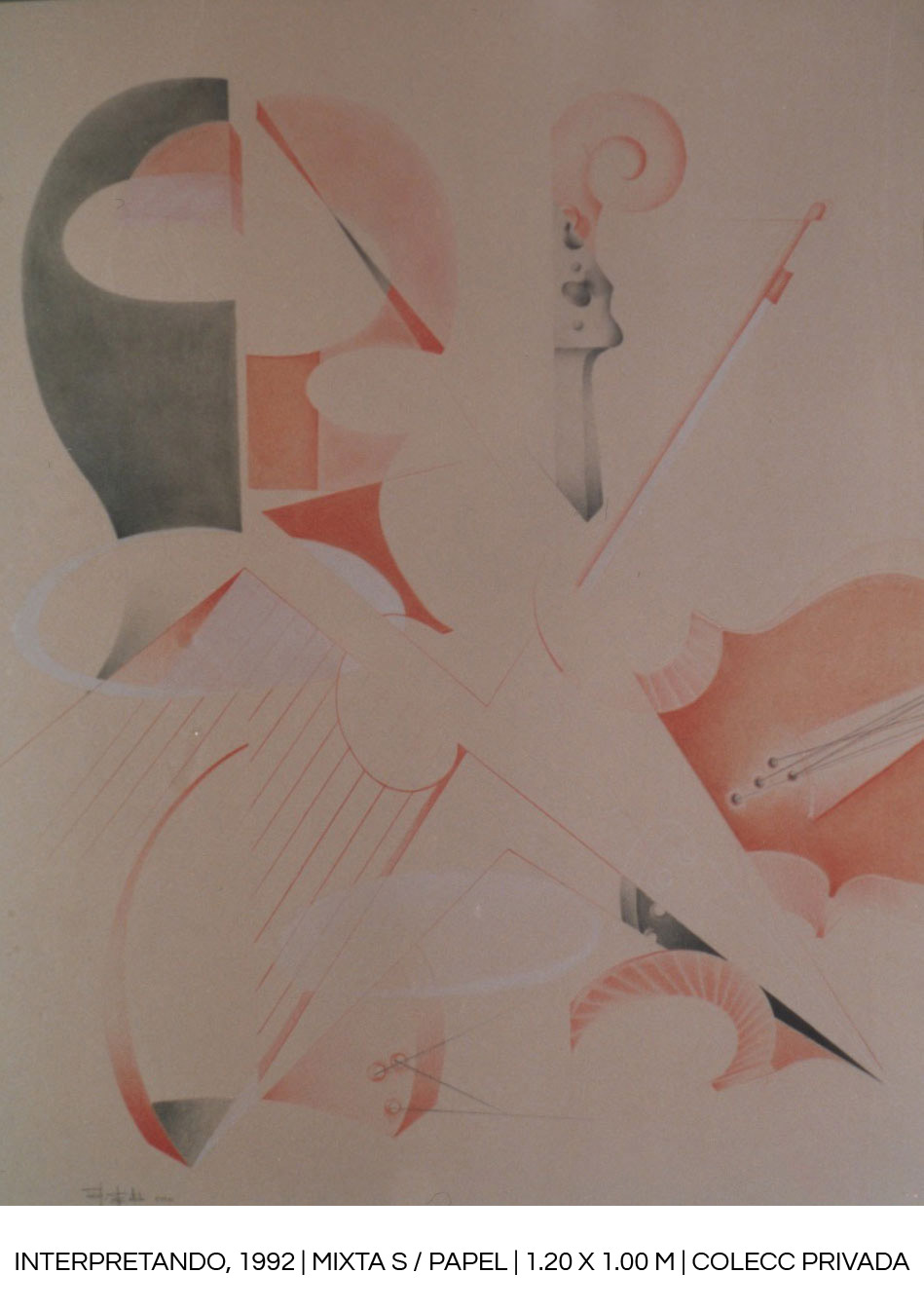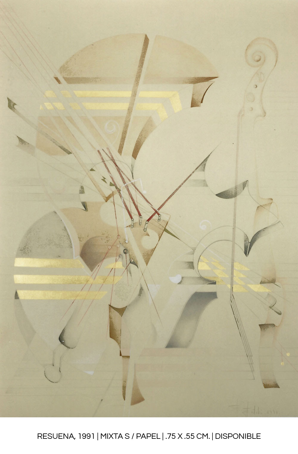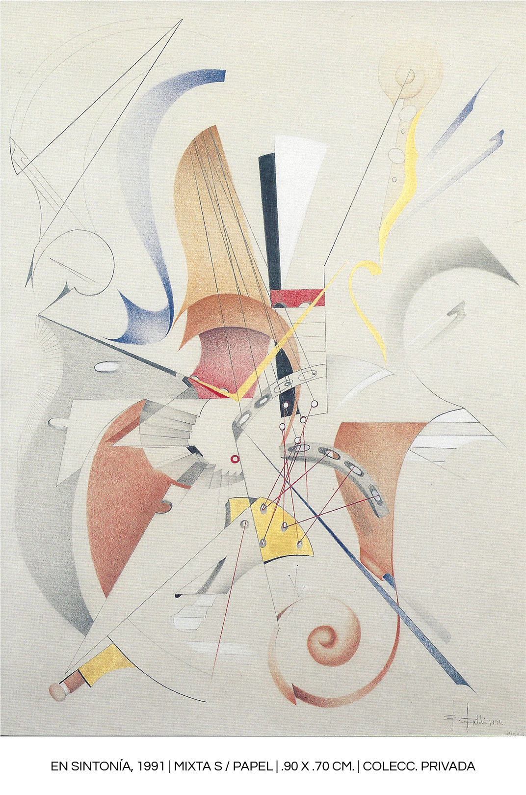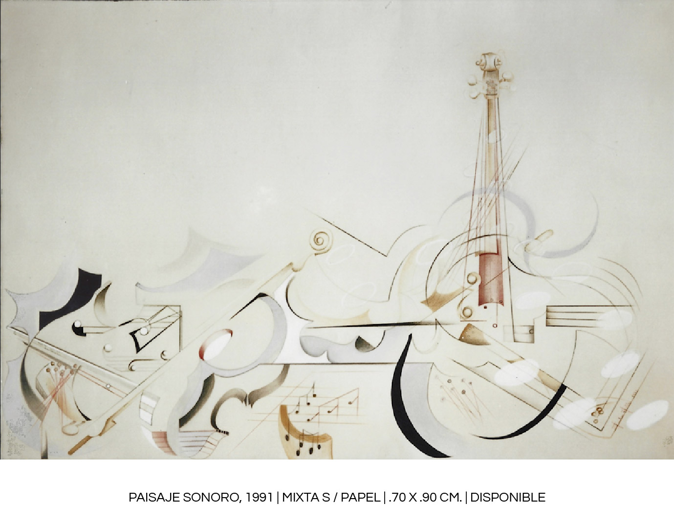 “Sus obras musicales usan la referencia al instrumento imaginario para dar lugar a un sentido de vibración, de ritmo, todo mediante composiciones continuas, juego de curvas y rectas que se entrecruzan.”